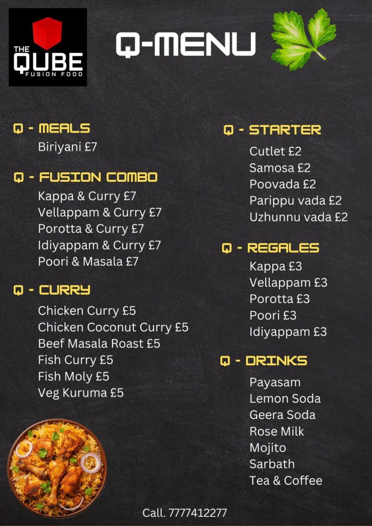 Experience the bold taste of Kerala on wheels! Order now, visit us in Stevenage, or contact us to bring the Qube fusion food truck to your next event.